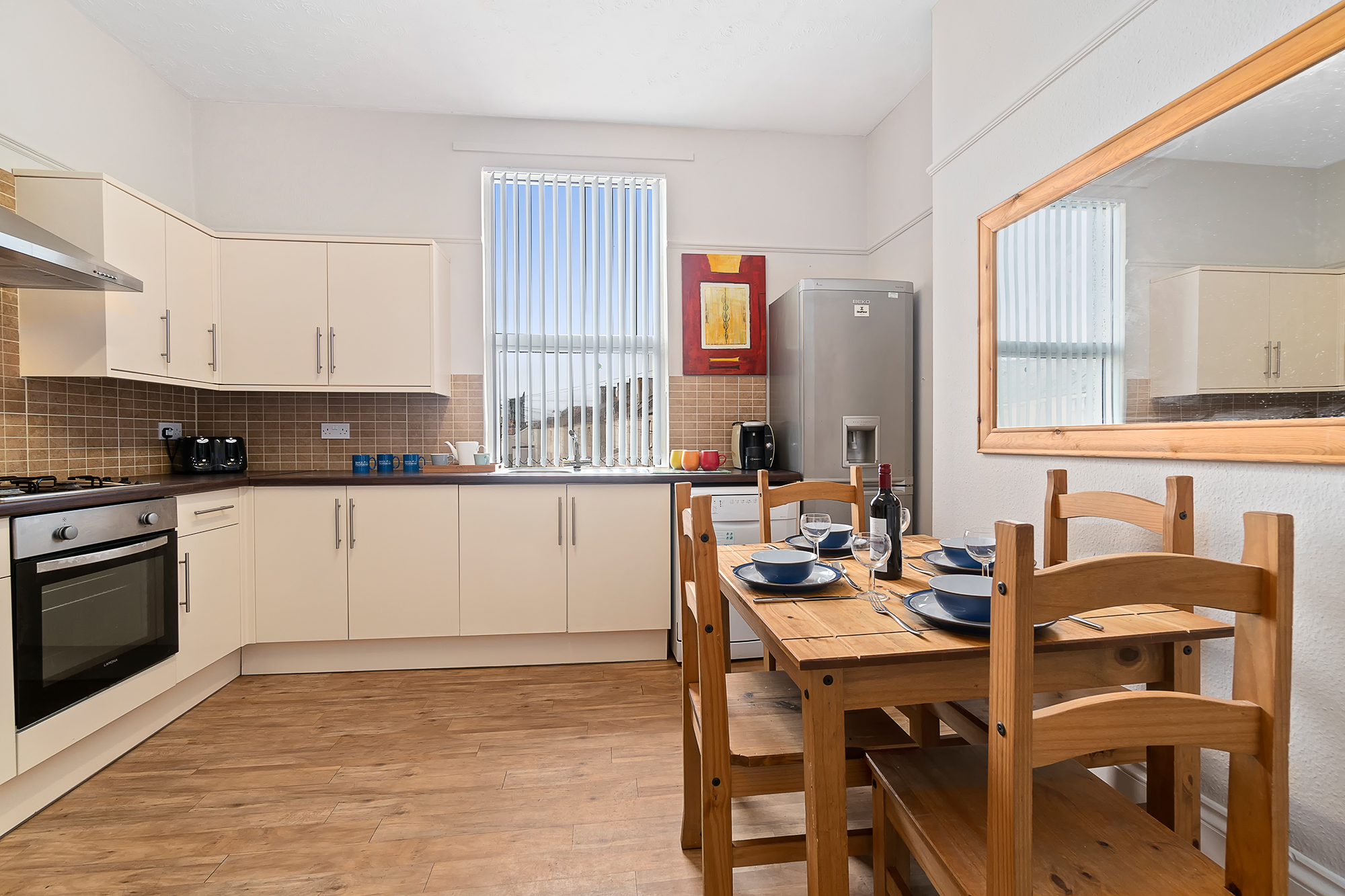There are two fully equipped modern kitchens, one located on the ground floor and the other on the first floor, one of which features a dishwasher and a dining table. At the back of the property, you will find a large paved patio area, ideal for barbecues. A separate lounge is located at the front of the property, which contains two leather sofas and a Smart TV.