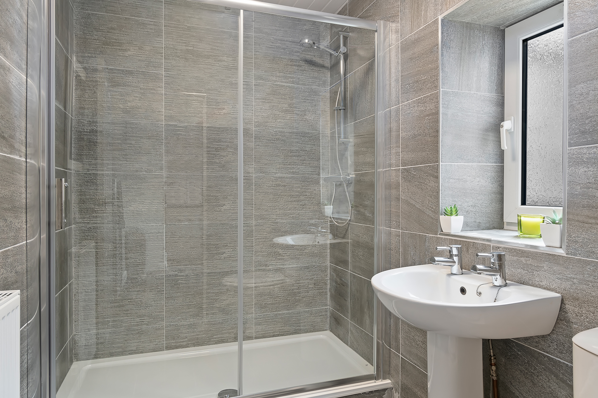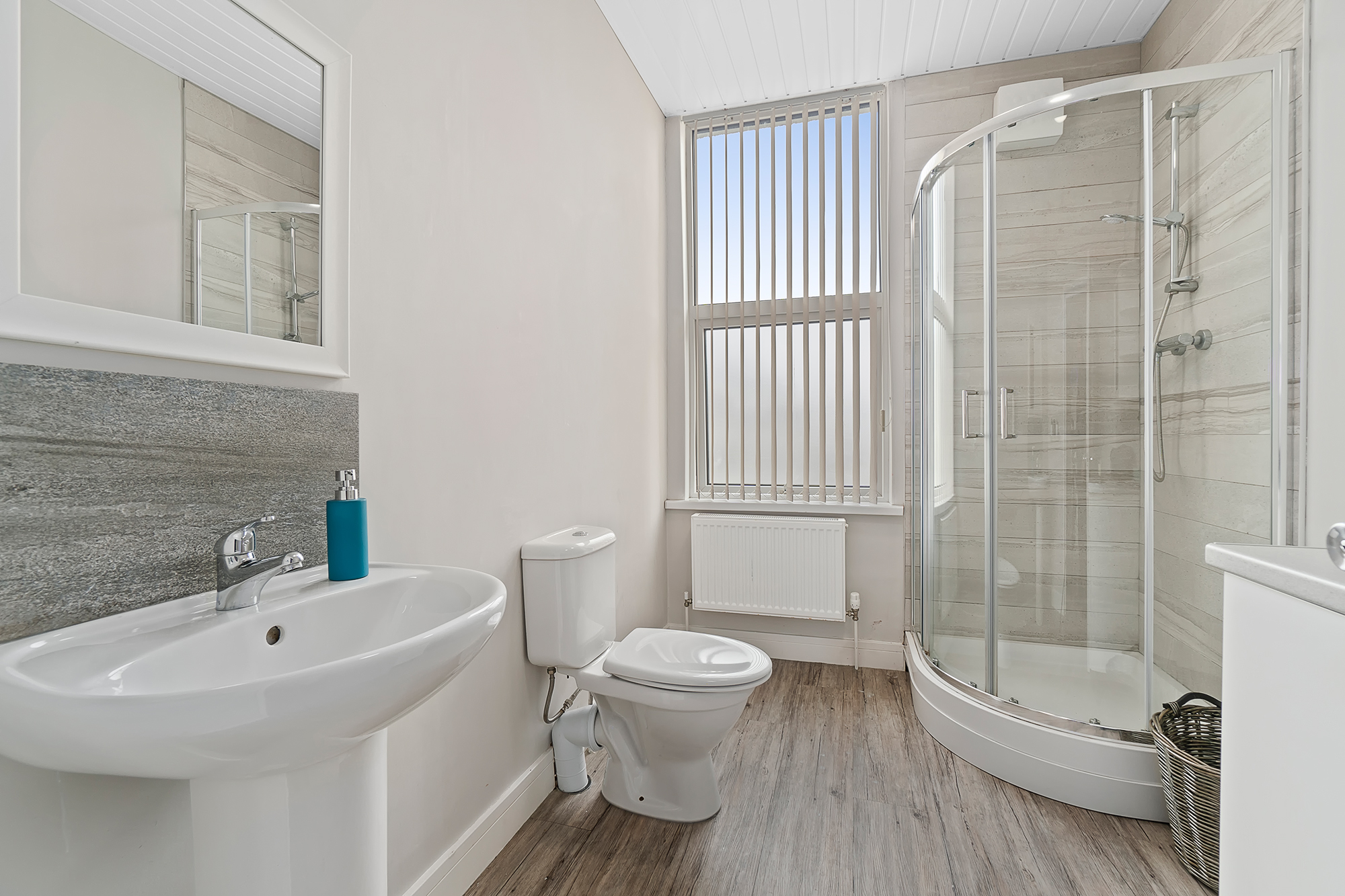 This student home features two bathrooms, both equipped with walk-in showers. There is also an extra toilet as well as a shower room.