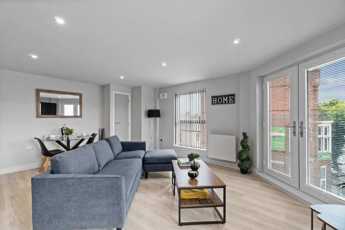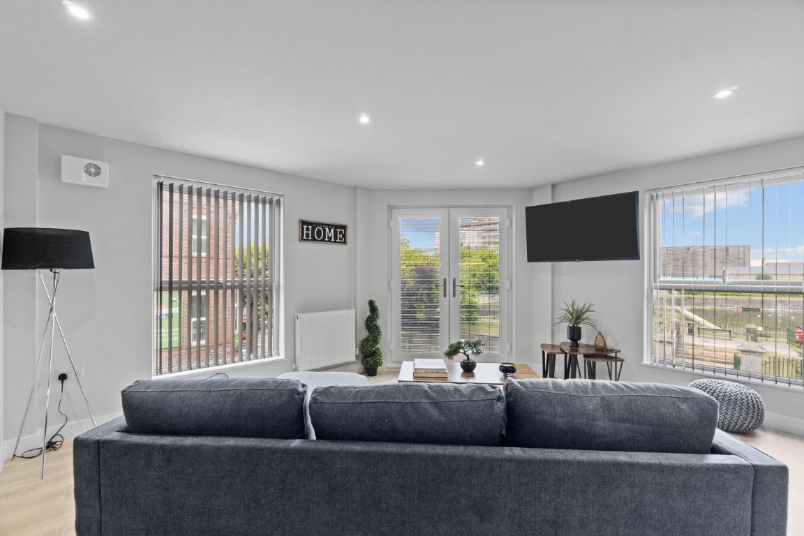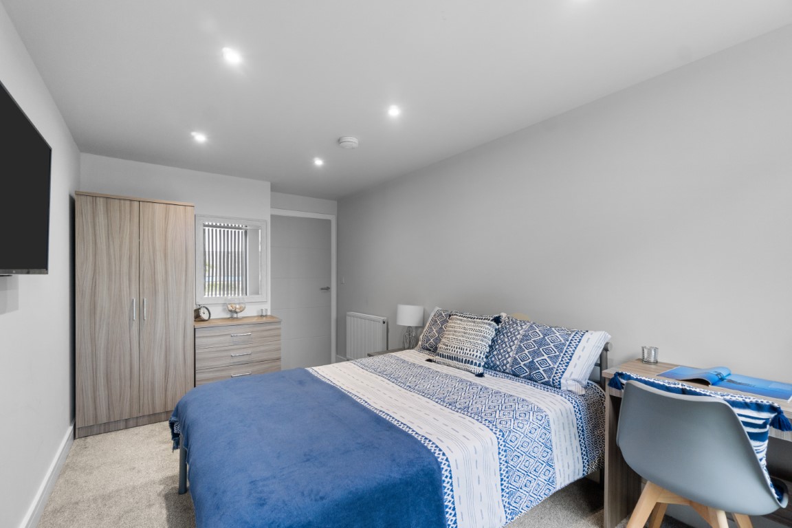 The spacious open-plan kitchen/lounge/diner contains a large sofa, a dining table, and a TV which is perfect for socialising. The kitchen is fully fitted with modern appliances, including a washer/dryer. At the end of this high-end apartment, you will find a Juliet balcony that overlooks the University of Plymouth’s reservoir.