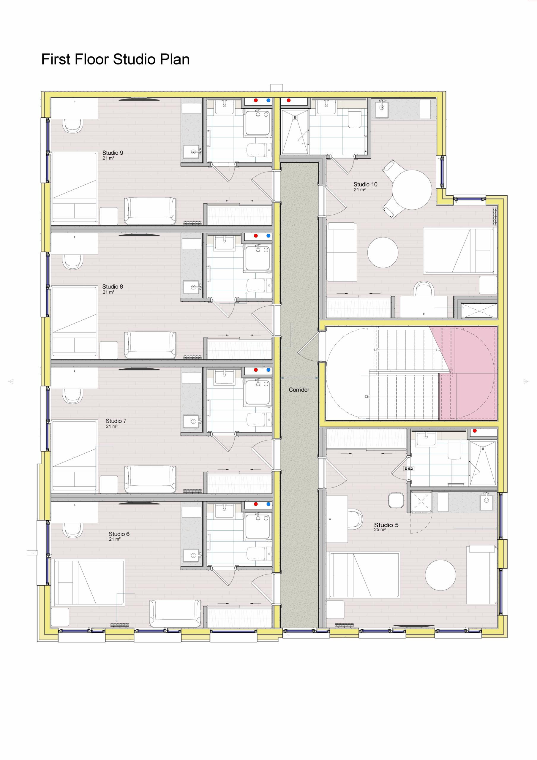 Each studio will have it’s own kitchen with built in fridge, oven and electric hob and a luxury modern ensuite shower room. Within the studio there will be a double bed, built in wardrobe, sets of drawers and desk and study area.